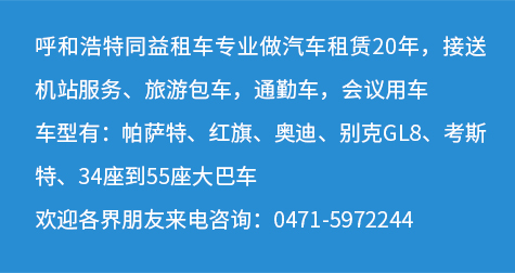 呼和浩特市同益汽車(chē)租賃有限公司成立于2005年,經(jīng)過(guò)二十多年的經(jīng)營(yíng)與發(fā)展,現(xiàn)已經(jīng)成為呼和浩特地區(qū)一家正規(guī)、專(zhuān)業(yè)的呼和浩特租車(chē)公司。公司創(chuàng)建以來(lái), 以將企業(yè)建成管理科學(xué)化,服務(wù)專(zhuān)業(yè)化,經(jīng)營(yíng)網(wǎng)絡(luò)化的優(yōu)質(zhì)汽車(chē)租賃公司而努力,以提供優(yōu)良的服務(wù)為立足之本。本公司實(shí)力雄厚,現(xiàn)有300多輛車(chē),高、中、低 檔的車(chē)型,備有5座--55座等等一系列車(chē)輛,可以滿(mǎn)足不同的消費(fèi)層次與需求。 我們擁有一個(gè)專(zhuān)業(yè)化,高度敬業(yè)的團(tuán)隊(duì),竭力為您提供熱情、周到、安全、舒適的優(yōu)質(zhì)服務(wù),歡迎咨詢(xún)我們關(guān)于呼和浩特租車(chē)|呼和浩特汽車(chē)租賃|呼和浩特商務(wù)車(chē)租賃|呼市租車(chē)等相關(guān)服務(wù)。